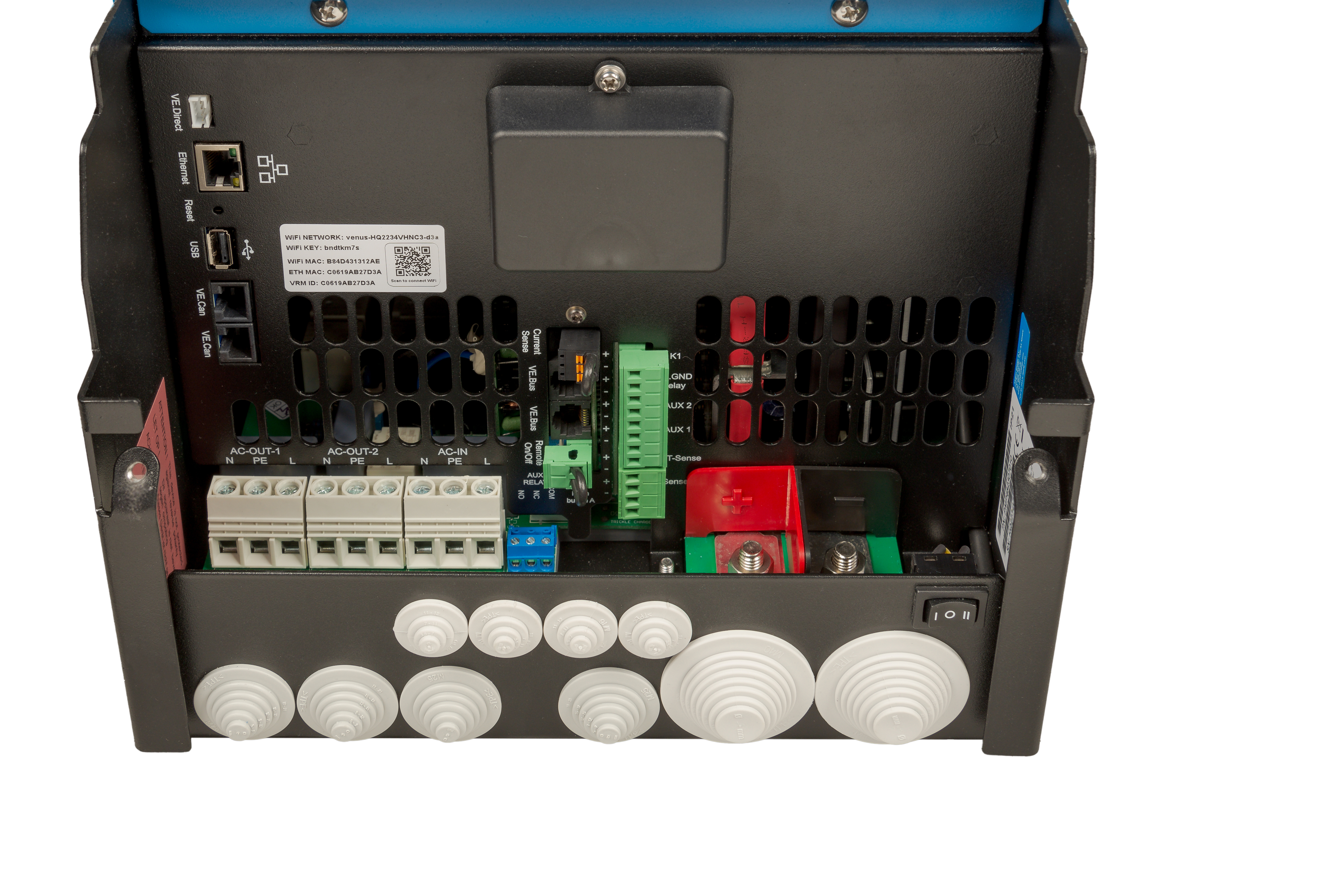 Den integrerade GX-enheten har flera anslutningsmöjligheter, inklusive ett BMS Can-gränssnitt för att ansluta till kompatibla CAN-bus-hanterade batterier, en USB-port, en Ethernet-port och en VE.Direct-port. GX-enheten styr både MultiPlus-II och SmartSolar MPPT med respektive en VE.Bus och en VE.Direct-anslutning.